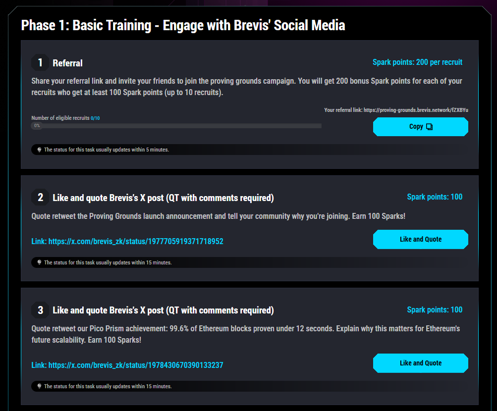 On October 13, 2025, Brevis has launched Phase 1 of the Proving Grounds program with Sparks (points) farming. In the future, earned Sparks will be converted into project tokens — the more Sparks you earn, the more tokens you’ll receive. Phase 2 of the activity will start on November 3.