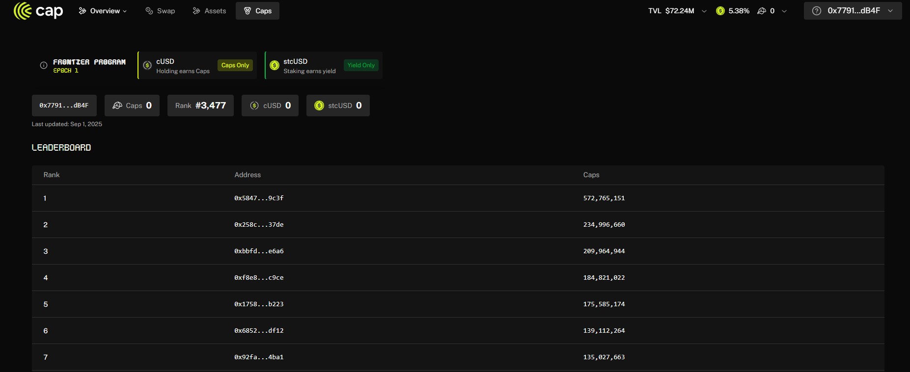 Cap’s Frontier Program moves into Epoch 2 on September 1. Epoch 1 successfully bootstrapped over M in cUSD reserves, with integrations from Pendle, Redstone, and others. In Epoch 2, cUSD and stcUSD holders, as well as Pendle and lending market participants, can earn Caps at boosted rates. With the yield engine coming online, Cap continues building around its two core assets: cUSD (stable, redeemable digital dollar) and stcUSD (yield-bearing version of cUSD).
