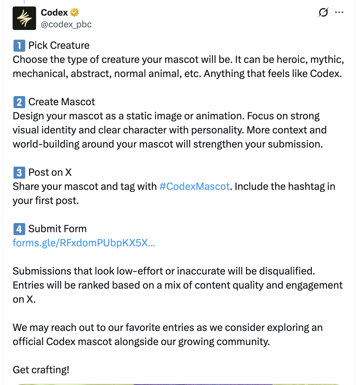 Review the terms and conditions, create your mascot, post it on X using #CodexMascot, and complete the submission form: