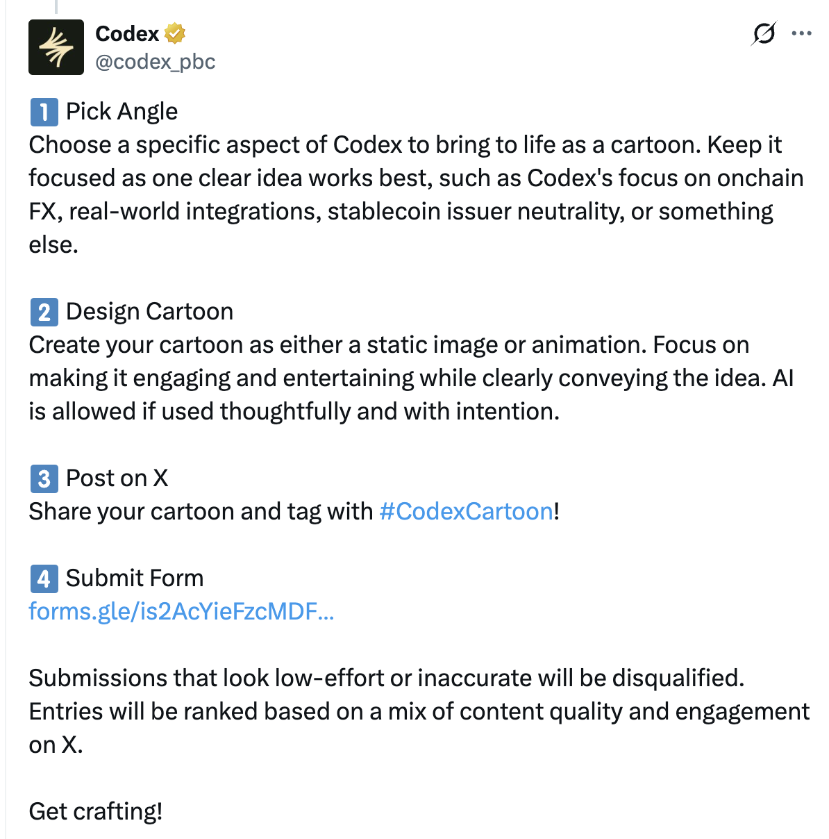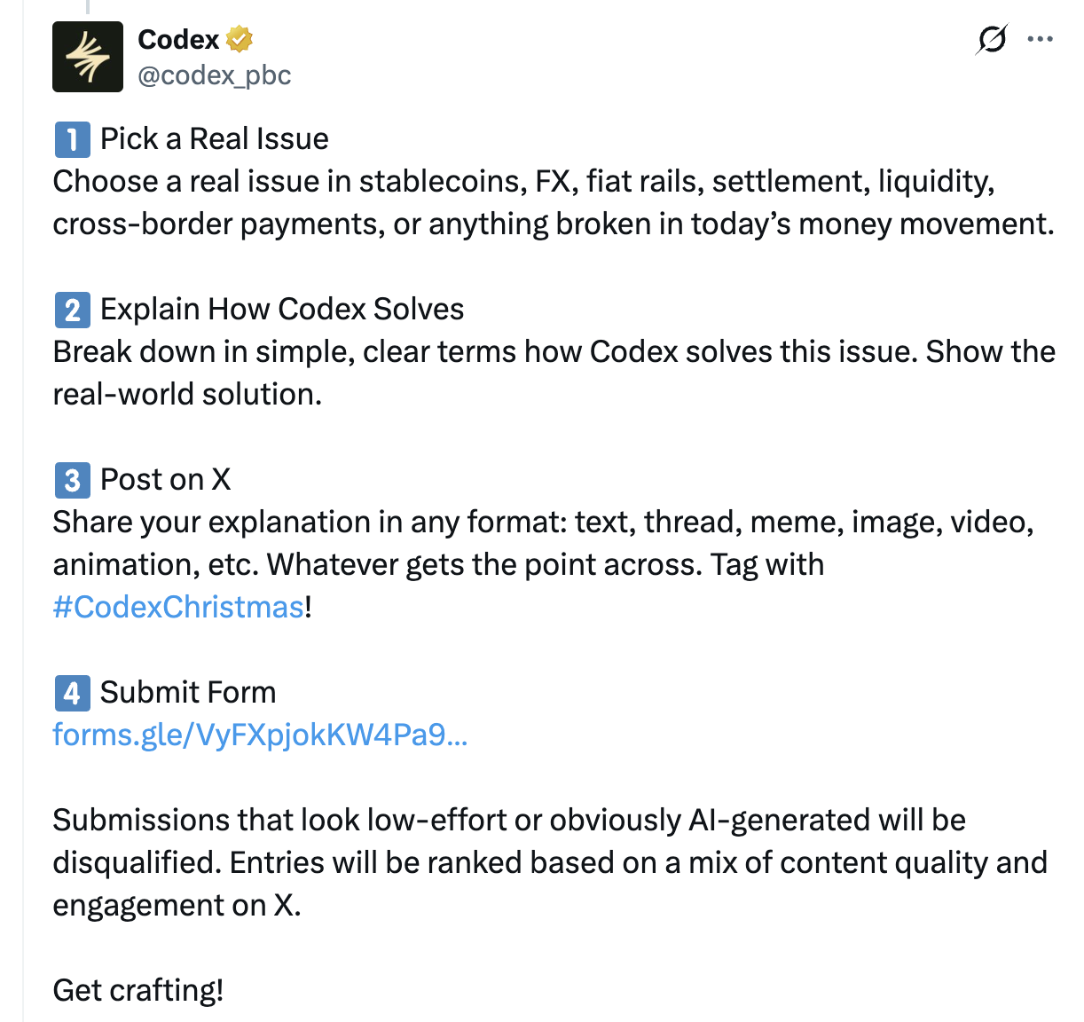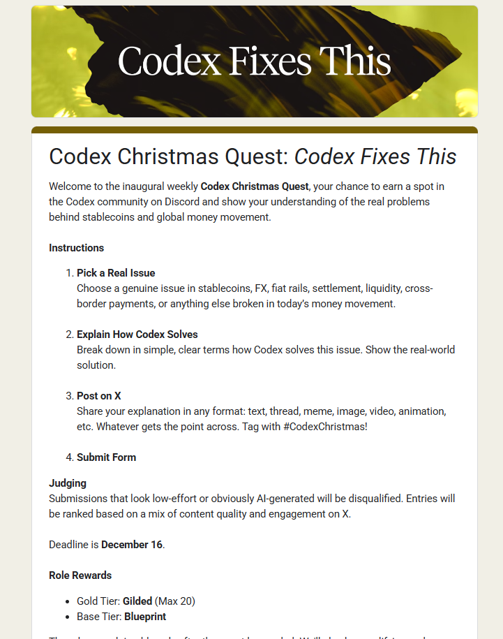 On December 10, 2025, Codex has launched a new weekly Christmas Quest where users can showcase their understanding of real stablecoin and global money movement problems — and earn exclusive Discord roles such as Gilded and Blueprint for high-quality submissions. The task is to highlight a real issue in payments, explain how Codex solves it, post it on X with #CodexChristmas, and submit the form.