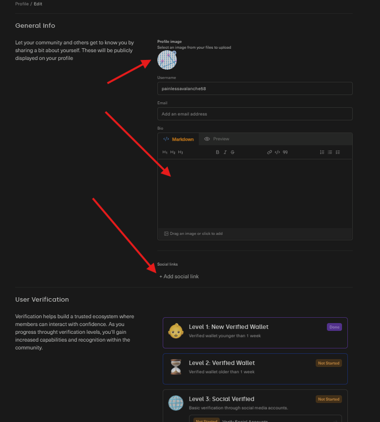 Complete your profile by clicking your nickname in the top-right corner, then Edit Profile. Upload an avatar and background, write a short bio, and optionally link your social media accounts. Scroll to the bottom and click Save.