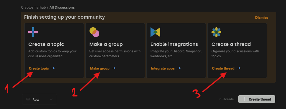 Create a thread: Enter a title, select a topic to display it in, write a description, and click Create Thread.