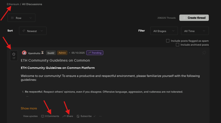 Activities in other communities: Visit any of the communities you previously selected, or search for a topic like “ethereum”. You can upvote, comment, create your own thread, and optionally share on Twitter/X.