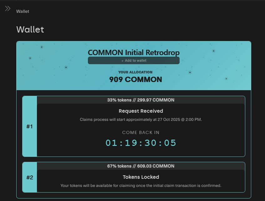 October 27, 2025, Common launched the on-chain claim for $COMMON tokens. Users can check their eligibility and see their allocation directly on the platform. Tokens are claimable based on the user’s participation in the ecosystem.