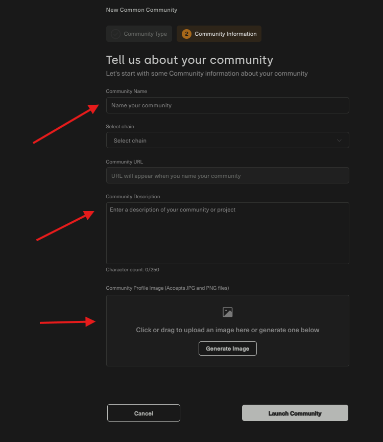 Next, enter a name for your community, write a description, and upload a profile image. Click “Launch Community”, then choose a ticker and a name, or keep the default options.