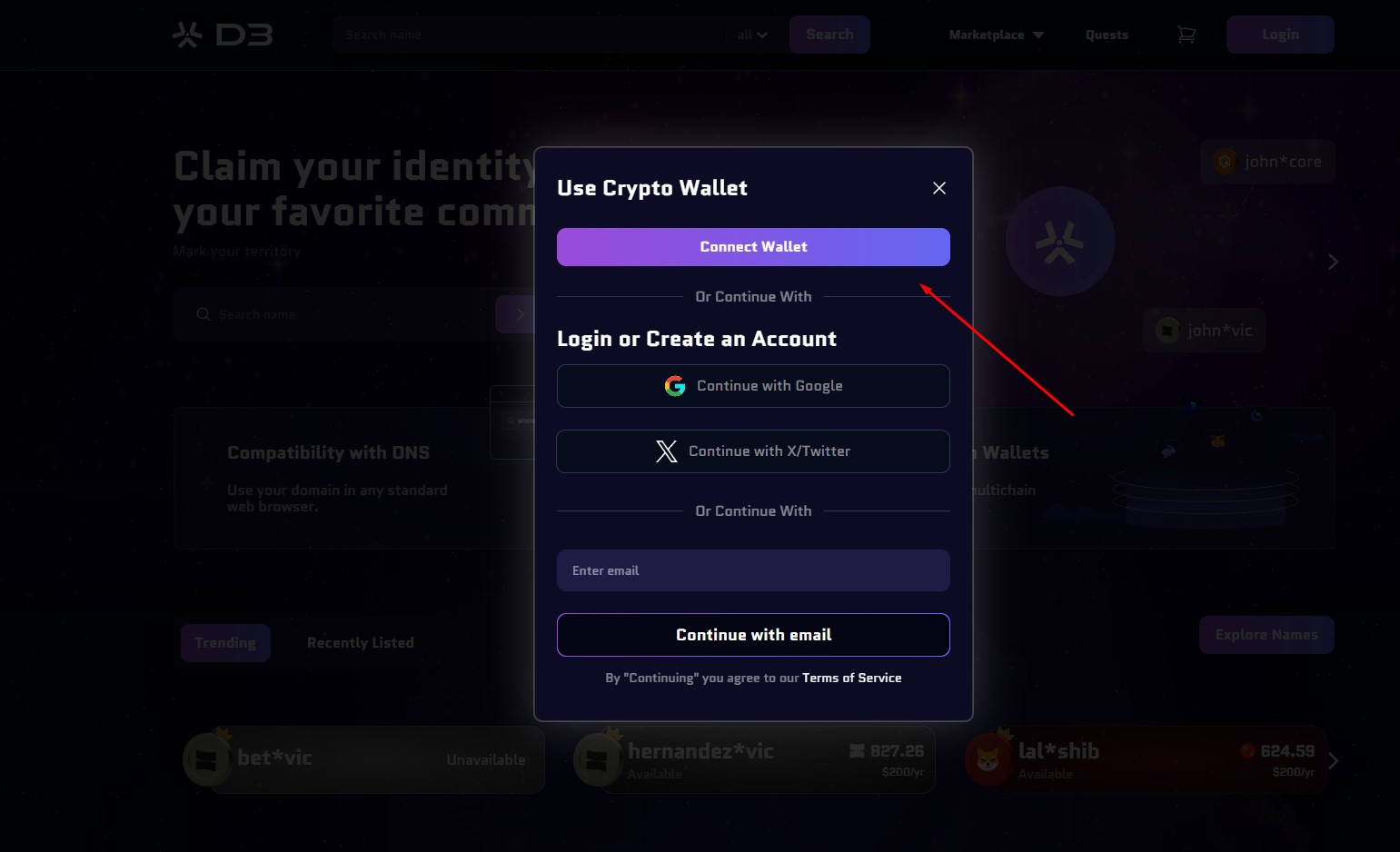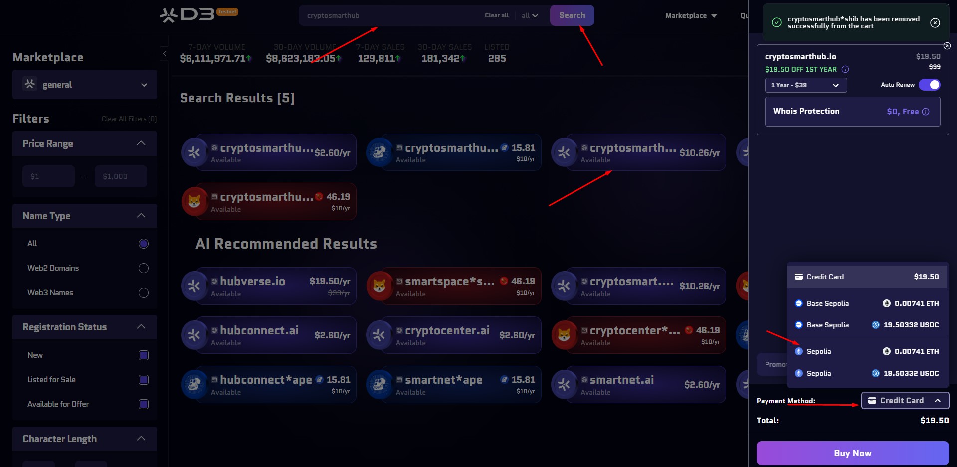 To interact with D3, you need to create an account and purchase at least one domain. Domains can be registered for a minimum of 1 year, starting at $10/year. You can pay using a credit card or through the Ethereum blockchain.