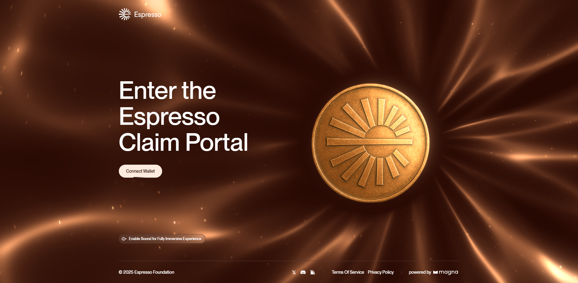 On December 22, 2025, Espresso has launched registration portal. Users can connect their wallets to check eligibility for the Espresso airdrop. This stage is for registration and eligibility verification only—the actual token claim will open in early 2026.