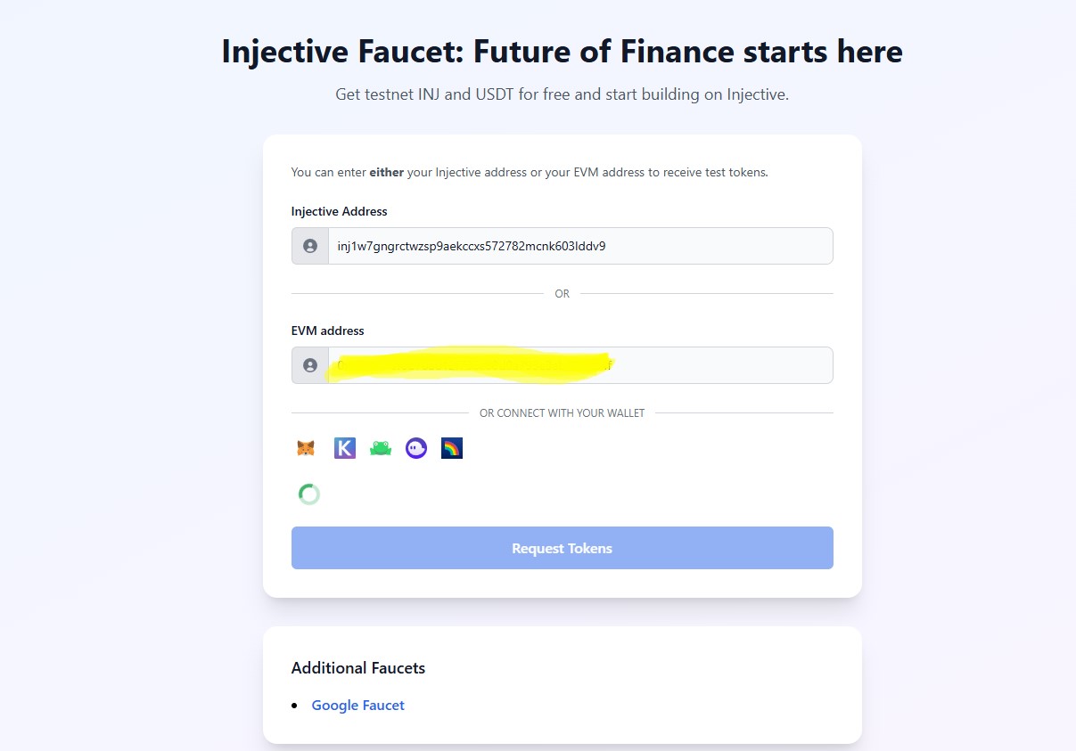Go to the website and claim testnet tokens. Simply enter your EVM address — your Injective address will be filled in automatically.