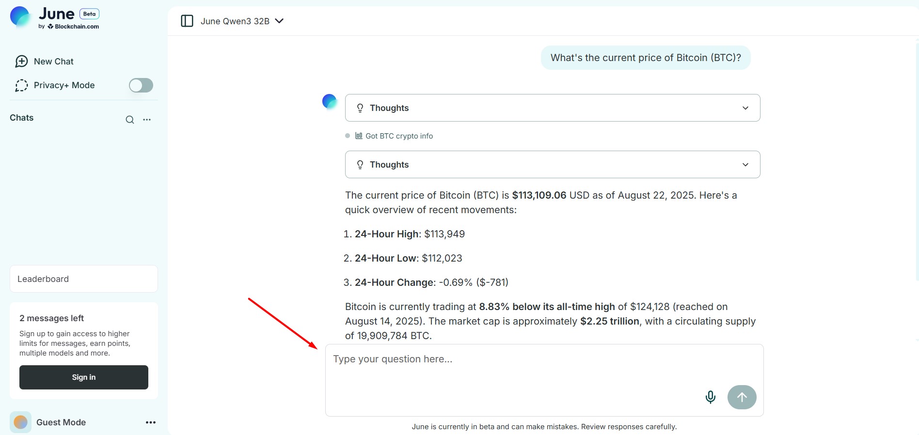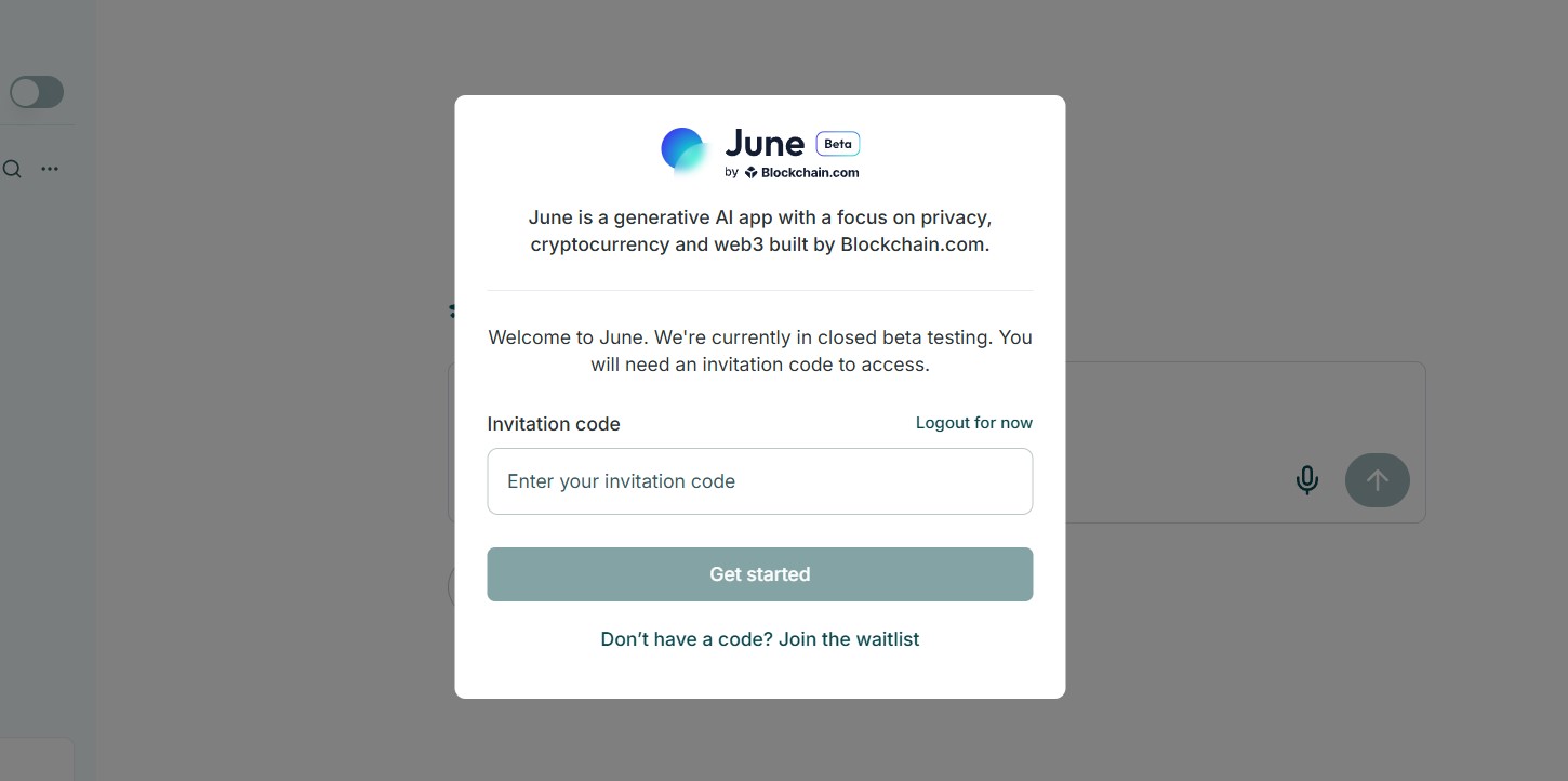 June is new AI from Blockchain.com. Currently, project is in Beta and you can get access only via invitation code. These codes can be found in their Discord. Also you can join the waitlist.