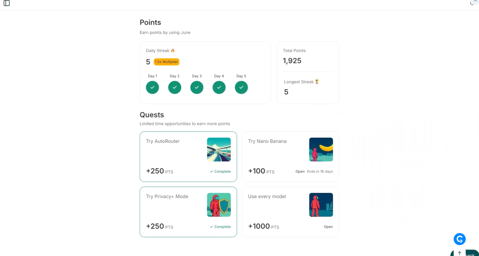 On October 16, 2025, June AI has introduced quests and streaks on the platform! Complete quests to earn extra points and boost rewards for daily AI interactions.
