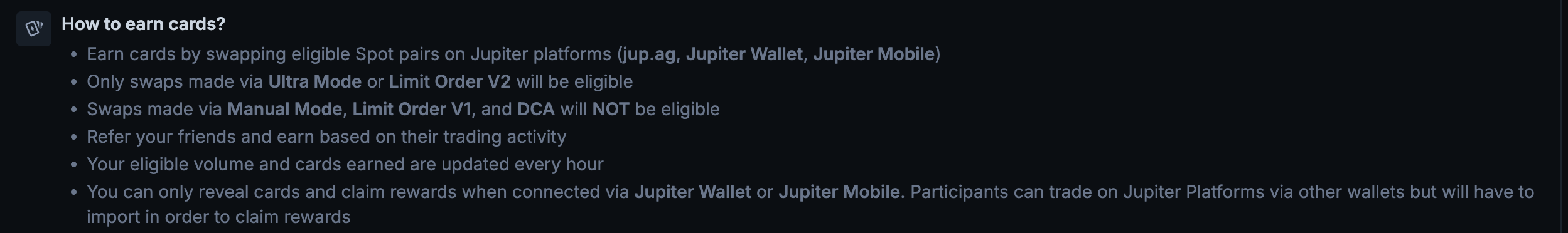 On December 12, 2025, Jupiter has launched a new campaign with a $1 million prize pool running until February 1. Users can trade on the platform, invite friends, and earn collectible cards, with five rarity tiers where higher rarity unlocks better rewards. Participation requires using the Jupiter Wallet browser extension.