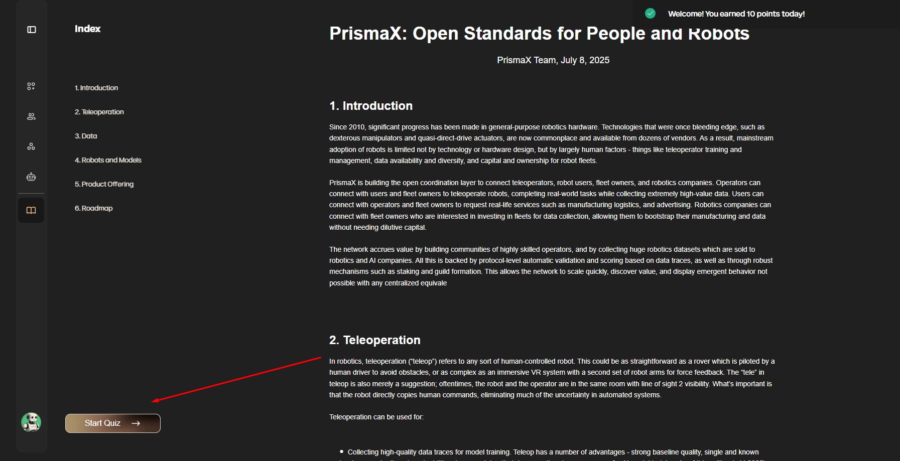 Quiz 1: According to PrismaX, what is the fundamental problem preventing mainstream robot adoption? Current AI models lack sufficient accuracy for autonomous operation, creating economic justification problems for robot ownership;