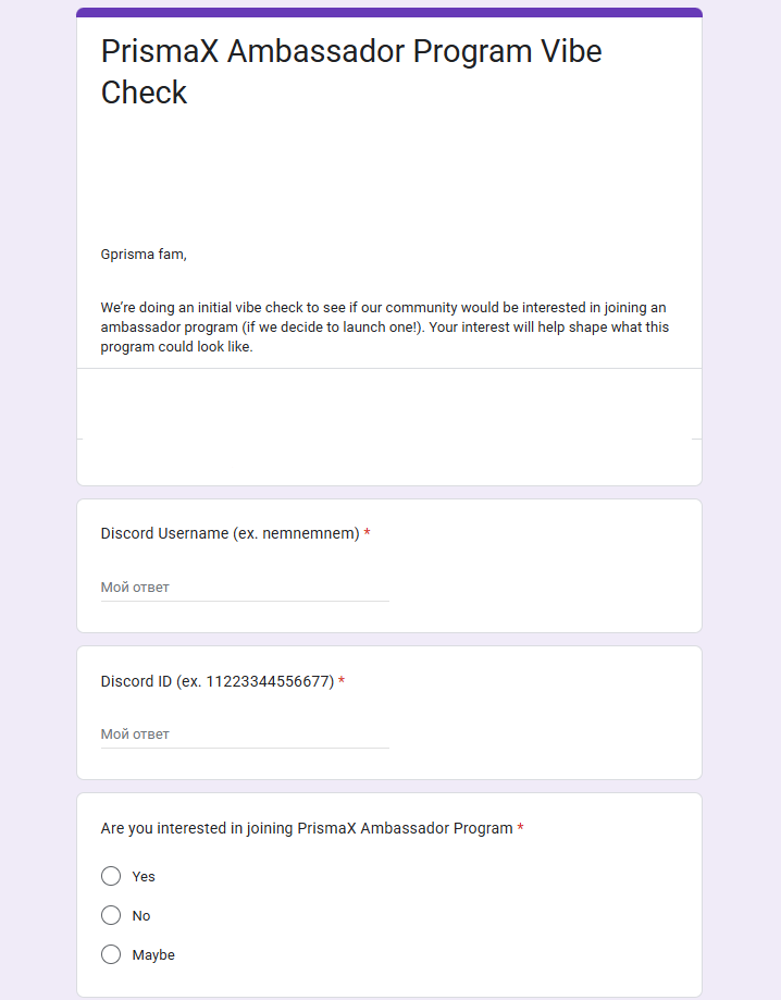 On November 27, 2025, PrismaX has opened a feedback form for its ambassador program on Discord. You can share your thoughts and suggestions about the program launch by submitting the form.