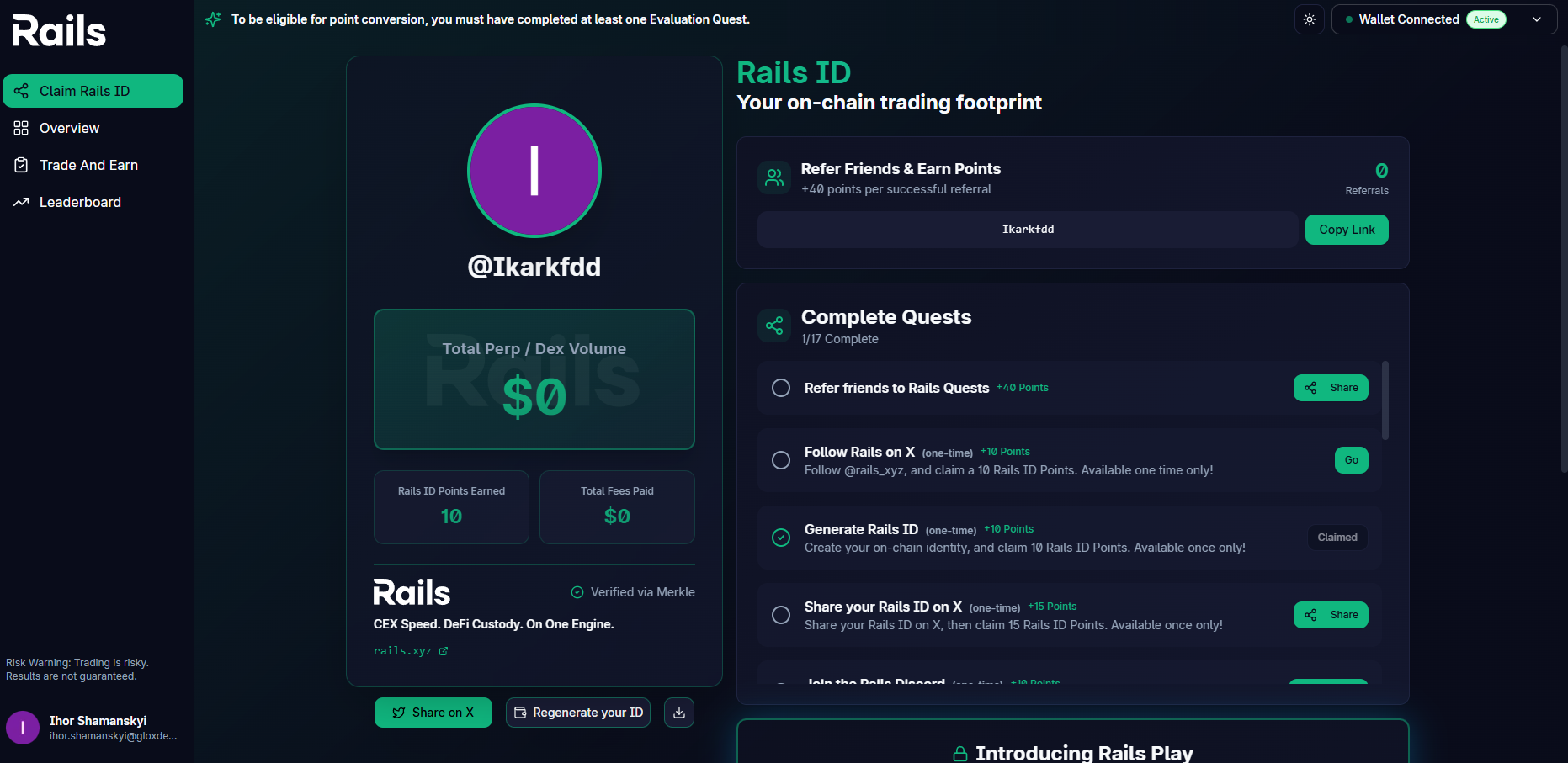 On December 8, 2025, Rails has kicked off a point farming program! You can earn points through free quests or by trading, which may count toward future airdrops.