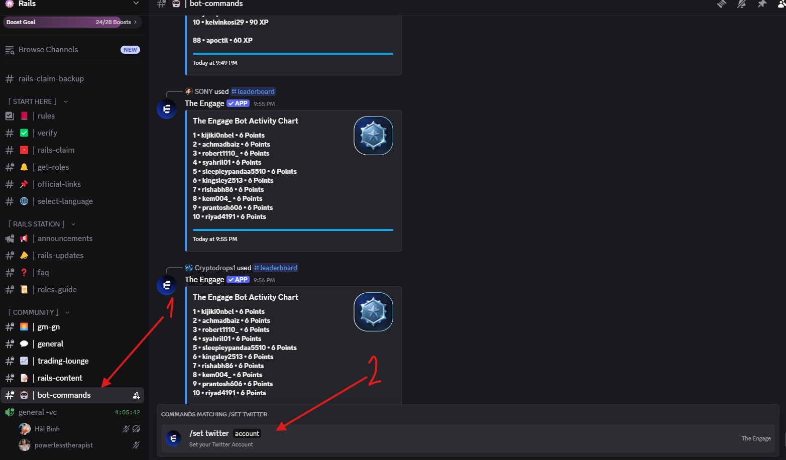 In the bot-commands channel, type the command /set twitter and enter your X (Twitter) username — this allows the bot to track your activity and points: