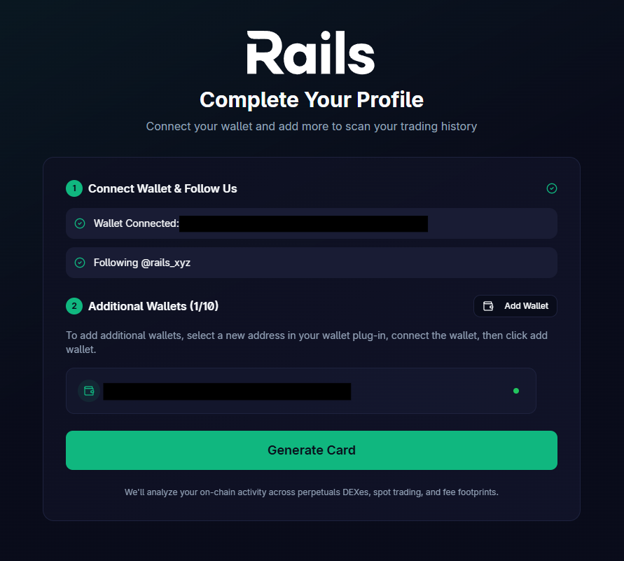Visit the website and connect the following wallets: Rails Wallet, Rails Play Wallet, and Rails Quest Wallet.