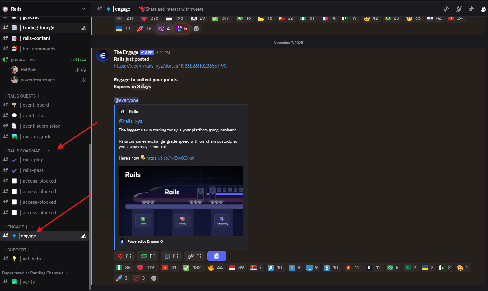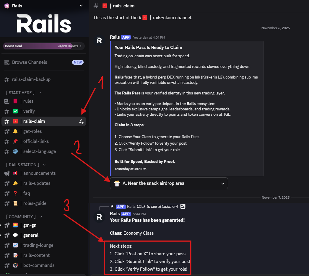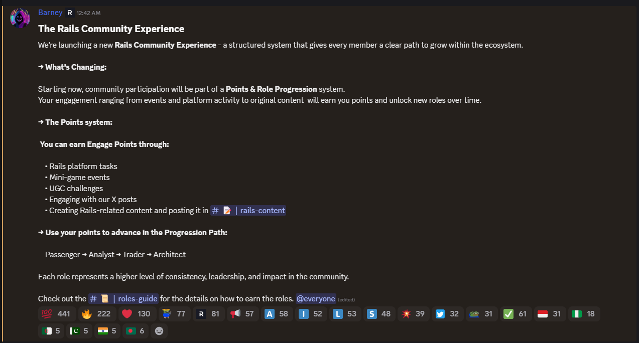On November 6, 2025, Rails has announced the launch of the Pass and Passenger roles on Discord! You can obtain them by completing a simple repost task on X.