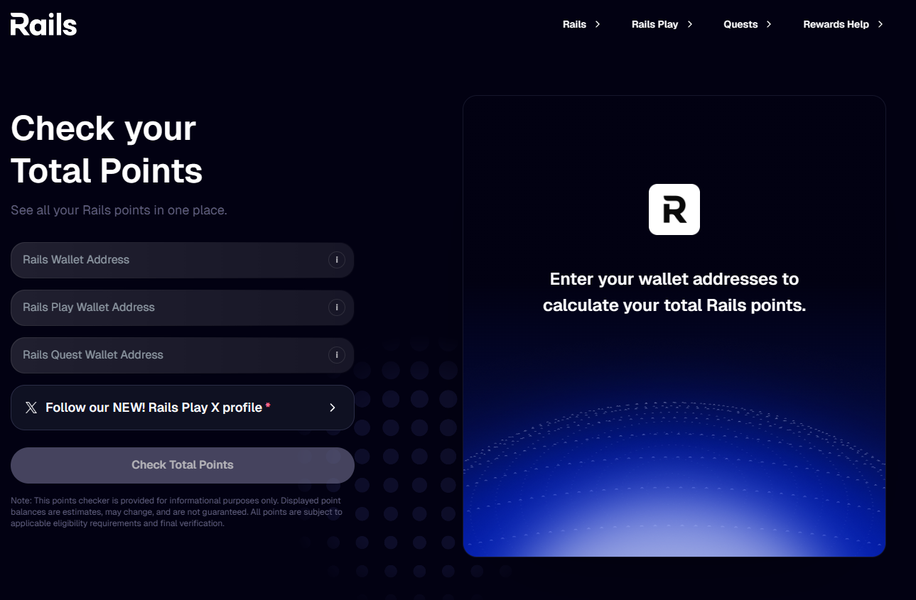 On January 19, 2026, Rails released the Rails Wallet Checker, allowing users to review their accumulated Rails Points before the earning period ends. The checker reflects eligibility based on completed activities, including participation in Rails Play evaluations. Only points earned by eligible users will be considered going forward.