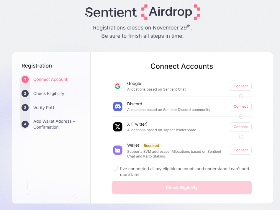 On November 17, 2025, Sentient launched its Airdrop Eligibility Checker and opened the official registration portal. Contributors can now connect all their wallets and accounts to verify whether they qualify for the airdrop, supported by strong Sybil protection and a one-time proof-of-uniqueness check. The allocation recognizes real contributors across the community, including Sentient Chat users, top voices, and open-source researchers. The portal does not show token amounts, but only confirms eligibility, and registration closes on November 29, 2025. Sentient will continue tracking contributions for Season 2 with more rewards coming soon.