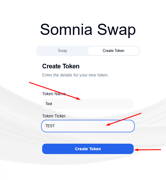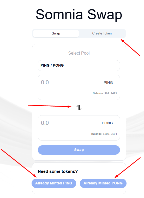 Mint PING and PONG test tokens, swap each for the other, then change direction and make the reverse swap. Change the category to 'Create Token' and create your own token. You need to input the token name and token ticker.