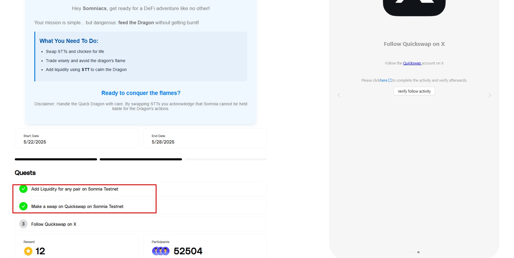 Somniacs, feed the Dragon!. Deadline: 28.05.2025. Here you need to make a swap and add liquidity. If you followed our guide, you have already done these activities so you can just verify these quests;