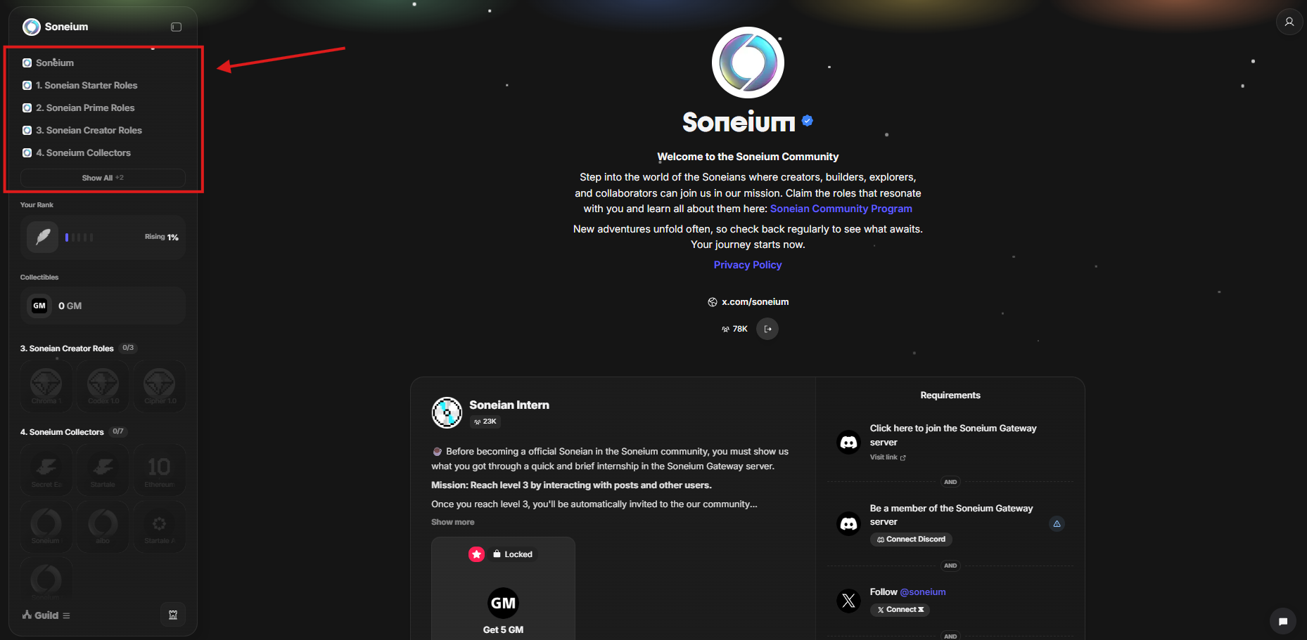 On July 8, 2025, Soneium has rolled out new Guild tasks! By completing them, you can earn multiple exclusive roles and badges, including the Soneium OG Badge and Secret Early Bird. If you previously received the OG badge, make sure to take part in this activity. Keep in mind that the website includes several sections with different roles.
