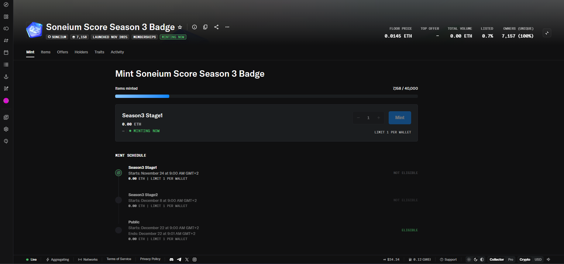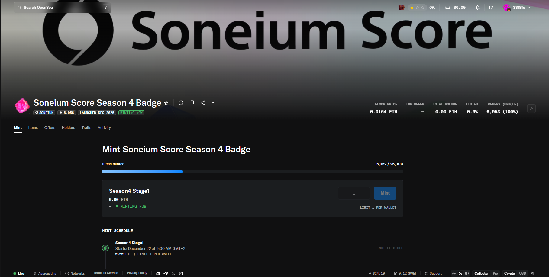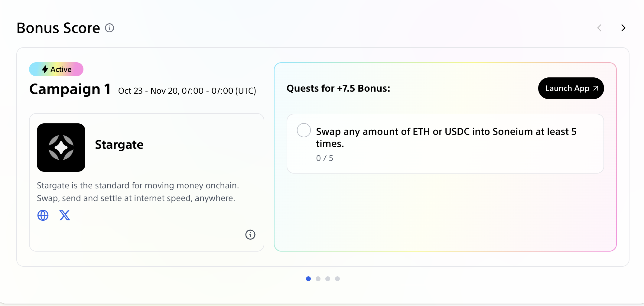 On November 20, 2025, Season 4 of the Soneium Score campaign has officially started. Continue making transactions on the Soneium network to earn points and badges. Participants who earned 80 points in Season 3 were able to mint a badge, and the same threshold applies for Season 4.