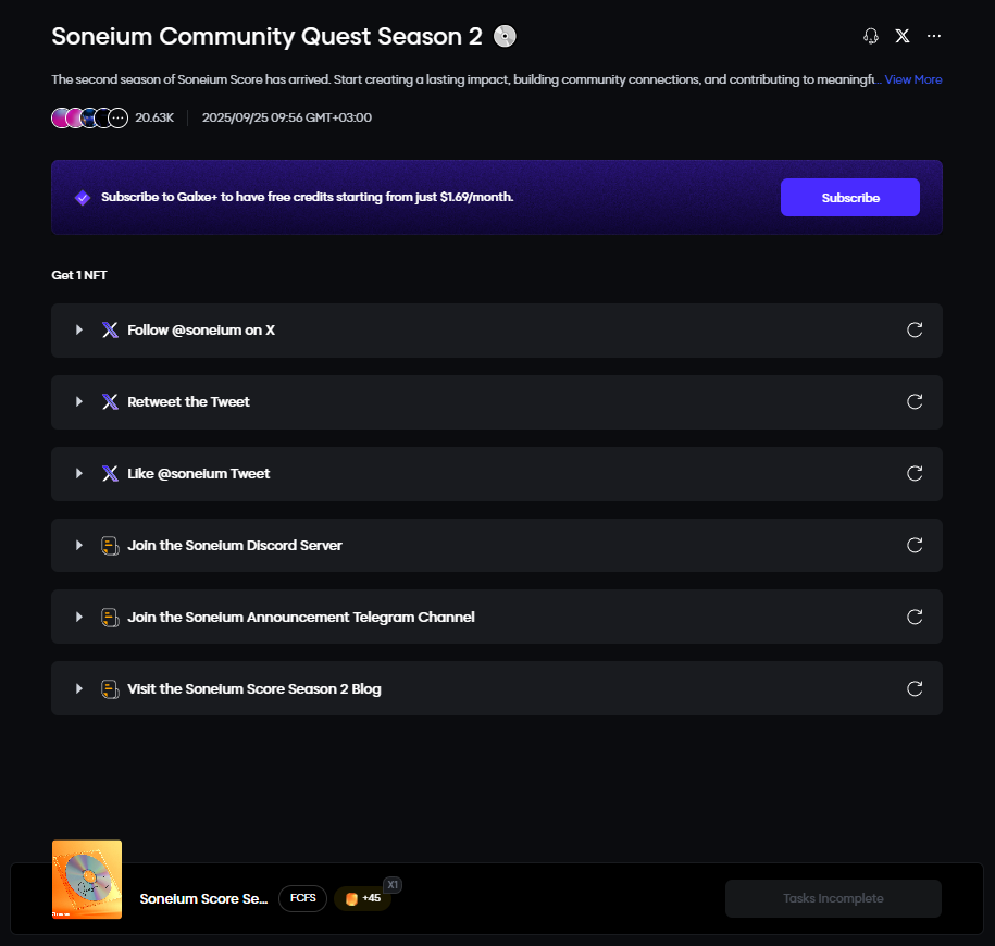 Soneium is not a new project — it has been running regular activities for users since 2024, though they are currently unavailable. However, on September 25, 2025, Season 2 of the Soneium Score campaign began. Users can once again make transactions on the Soneium network to earn points and badges. Those who earned 80 points in Season 1 are eligible to mint a badge, and the same 80-point requirement applies for a badge in Season 2.