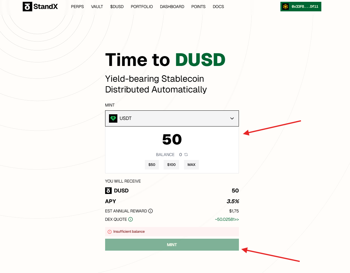 Open the $DUSD section and mint DUSD using USDC or USDT: