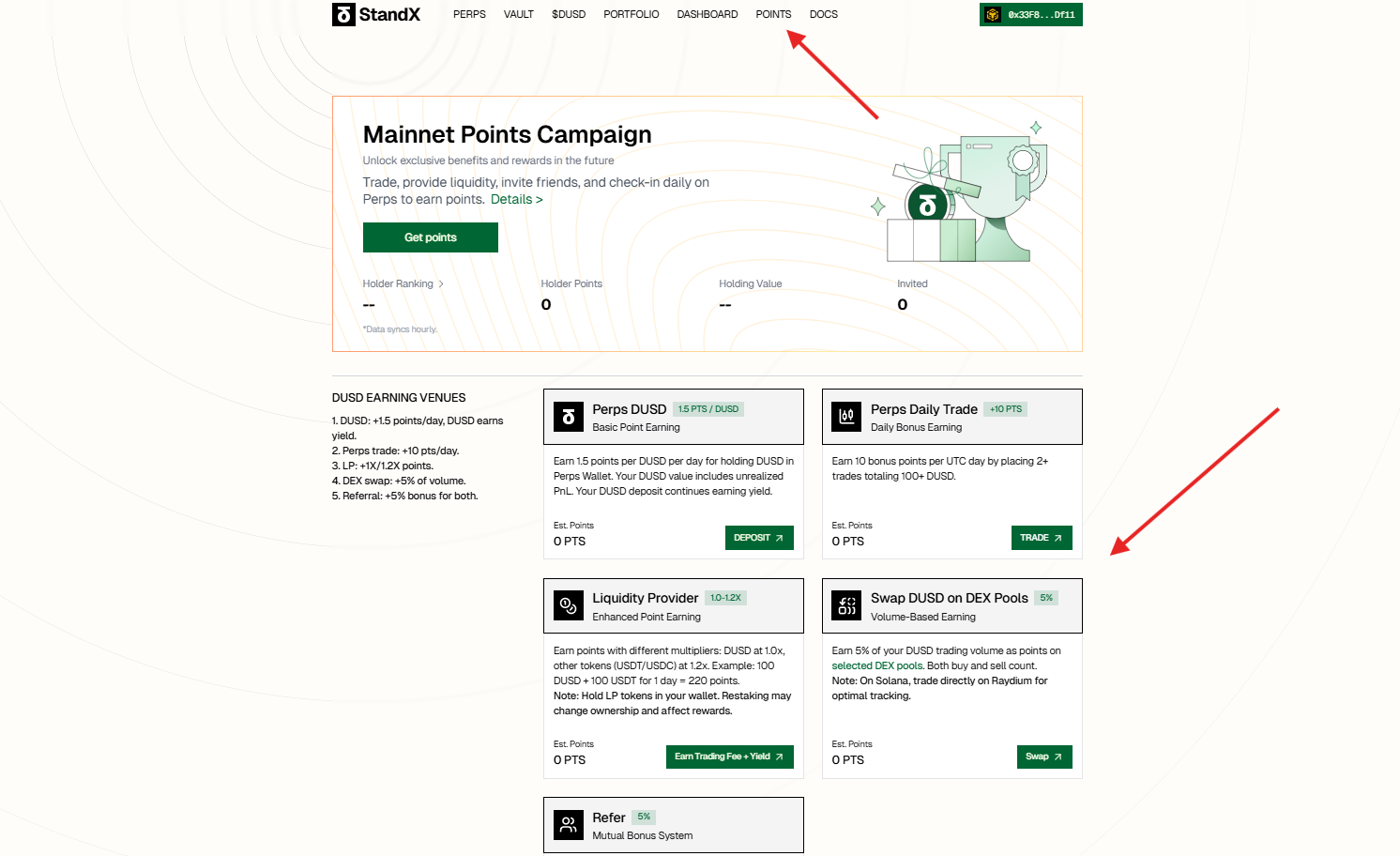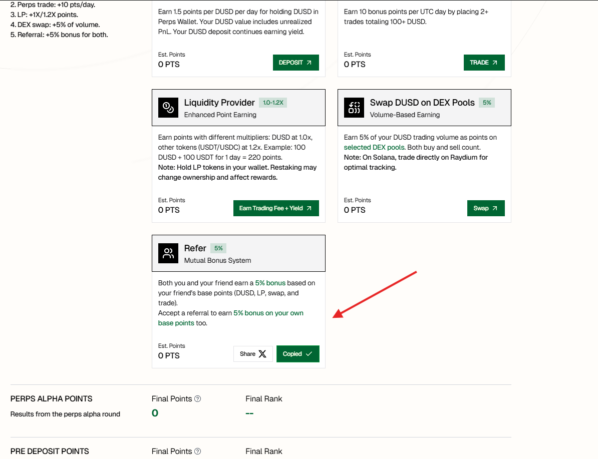 Go to the Points tab and start farming points by holding DUSD in your Perps account, trading, and providing liquidity. You can monitor your progress and leaderboard rank on the same page.
