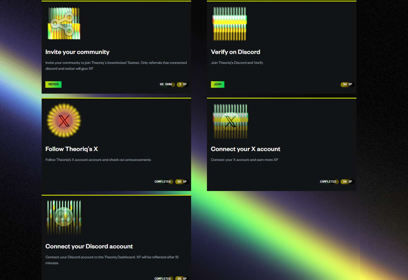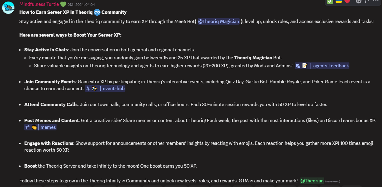 Earn XP by engaging with the Theoriq community, level up, unlock roles, and gain access to exclusive rewards and tasks. Every minute that you're messaging, you randomly gain between 15 and 25 XP. More details here.