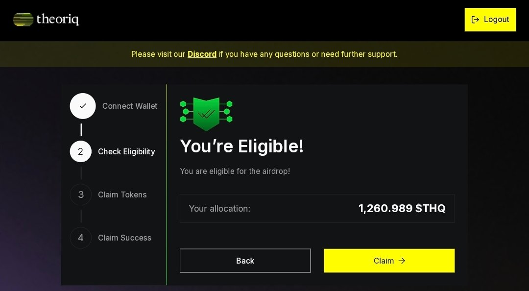 Go to the Theoriq Airdrop Claim Portal, connect the X account tied to your Ambassador/Yapper activity or the wallet you provided to the team.
