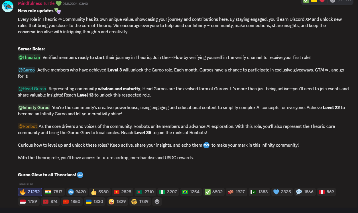 Every role in Theoriq Community has its own unique value, showcasing your journey and contributions here. By staying engaged, you’ll earn Discord XP and unlock new roles that bring you closer to the core of Theoriq. Theroiq encourages everyone to help build Infinity community, make connections, share insights, and keep the conversation alive with intriguing thoughts and creativity!